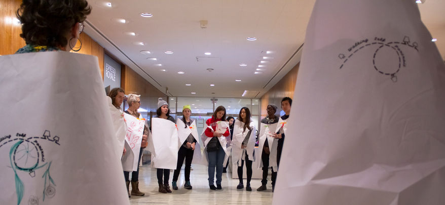 At the start of the workshop, the group assembled into a single-file line, entered the museum, and began a slow paced, silent walk around the galleries. The rustling of paper capes and processional performance walk created a unique atmosphere within the museum space. Passersby and museum guards stared curious, amused, and maybe slightly unsettled at this unconventional scene.